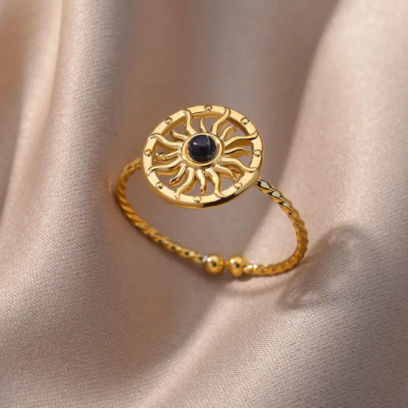 Anillo “Sol de Obsidiana”en Acero Inoxidable y Chapado en Oro de 18K