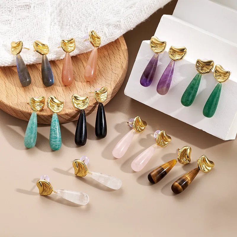 Aretes de Gota de Ojo de Tigre (Piedra Natural) en Plata 925 y Chapado en Oro de 18K
