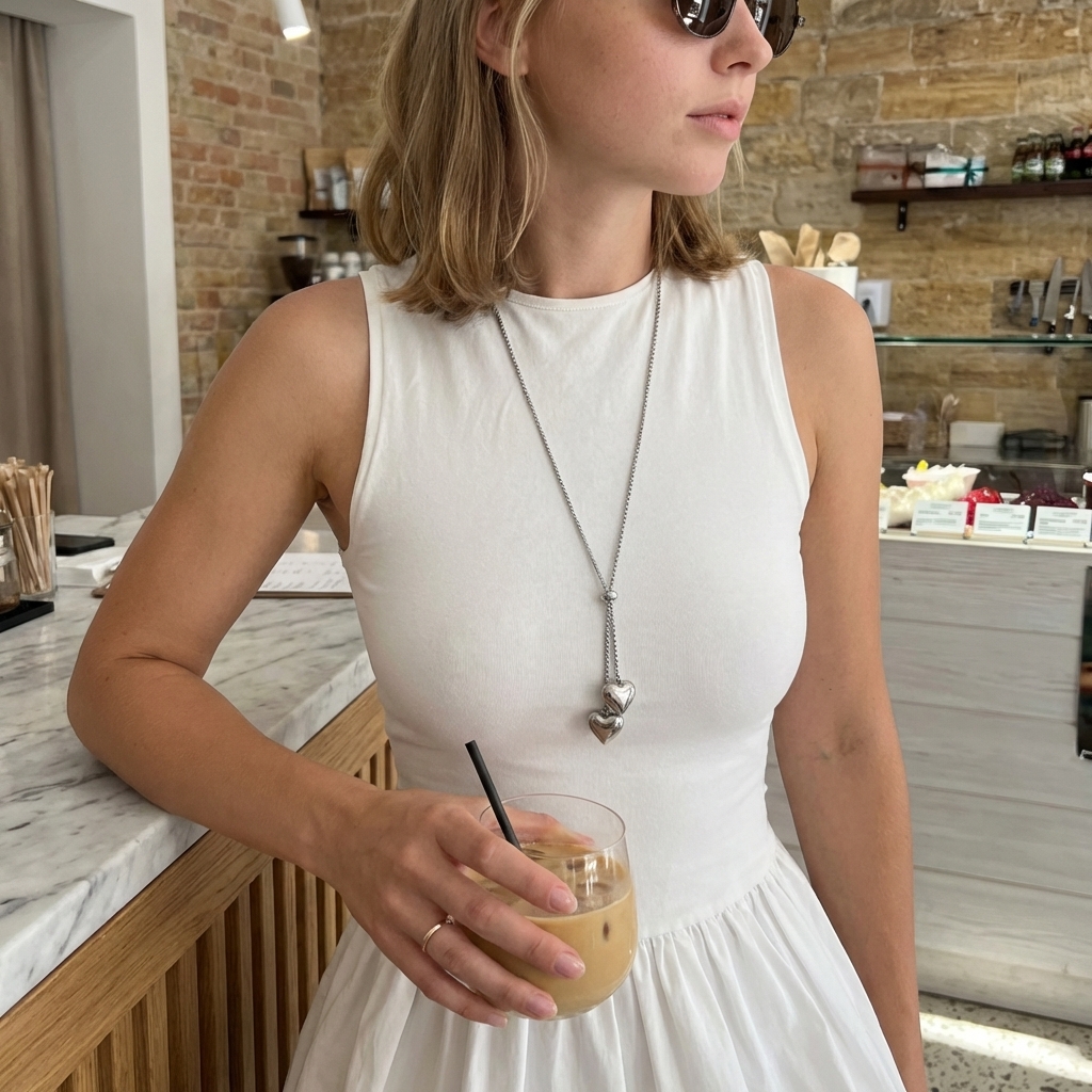 Collar “Doble Corazón” en Acero Inoxidable y Chapado en Oro Blanco de 18K